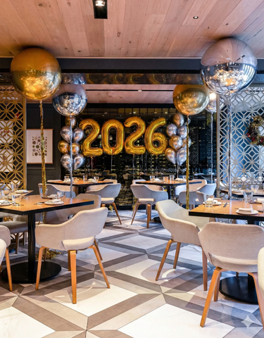 Our Premium New Years Eve Packages feature our ultra luxe ORBZ ceiling balloons to create a high-end, luxurious effect. Larger then life at 24" big and in shades of chrome gold and silver with a extra-long upgraded matching metallic tassel. These are not your regular balloons and will be sure to make an impact at your event.