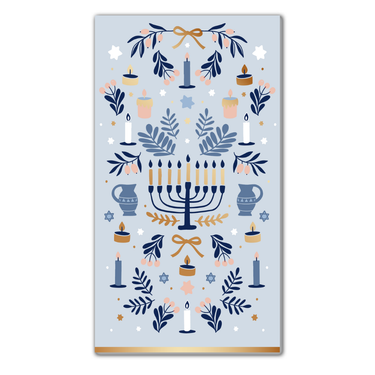 Our Modern Hanukkah Dinner Napkins feature a serene dusty blue background adorned with menorahs, candles, and delicate botanical details, accented by a gold foil trim. Designed for both style and function, these napkins add a graceful touch to your holiday table - perfect for dinner parties, buffets, or as elegant bathroom hand towels during gatherings.