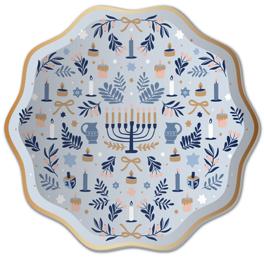 Our Modern Hanukkah collection celebrates the beauty of tradition with a refined, contemporary take. Featuring a soft palette of dusty blue and navy accented with warm gold foil details, it’s designed to bring a sense of calm sophistication and joy to every celebration. Delicate motifs of menorahs, dreidels, olive branches, and candlelight evoke the spirit of the season with symbols of light, hope, and togetherness. From festive Hanukkah dinners to family gatherings, each piece is crafted to help you create a table that feels meaningful, elegant, and effortlessly beautiful. Our Modern Hanukkah Small Plate features a soft dusty blue background adorned with menorahs, candles, and olive branches, finished with a shimmering gold foil edge. A modern yet nostalgic take on Hanukkah design, it’s perfect for serving appetizers, desserts, or layering with our matching dinner napkins for an elegant and coordinated tablescape.