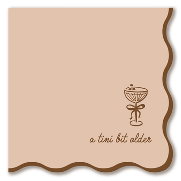 Celebrate another year older (and maybe wiser) with a cheeky twist on the trendiest cocktail around - the espresso martini. These chic mocha brown cocktail napkins feature a playful coupe glass illustration tied with a bow and the trending phrase “a tini bit older.” Finished with scalloped edges, this design feels sophisticated yet fun, making it perfect for birthday bashes, cocktail parties, or late-night soirées. Whether paired with an espresso martini, a classic cosmo, or sparkling bubbles, these napkins bring a stylish nod to the viral cocktail trend dominating Instagram and TikTok. Details - Includes 20 napkins - Size: 5" cocktail napkin - Espresso martini–inspired birthday theme - FSC-certified paper - Not microwave-safe Why Your Customers Will Love It: The espresso martini is having a major moment, and these napkins let customers serve the look alongside the drink. With their rich mocha tones and playful design, they’re an instant hit for boutique party shops, gift stores, and chic hosts who love to